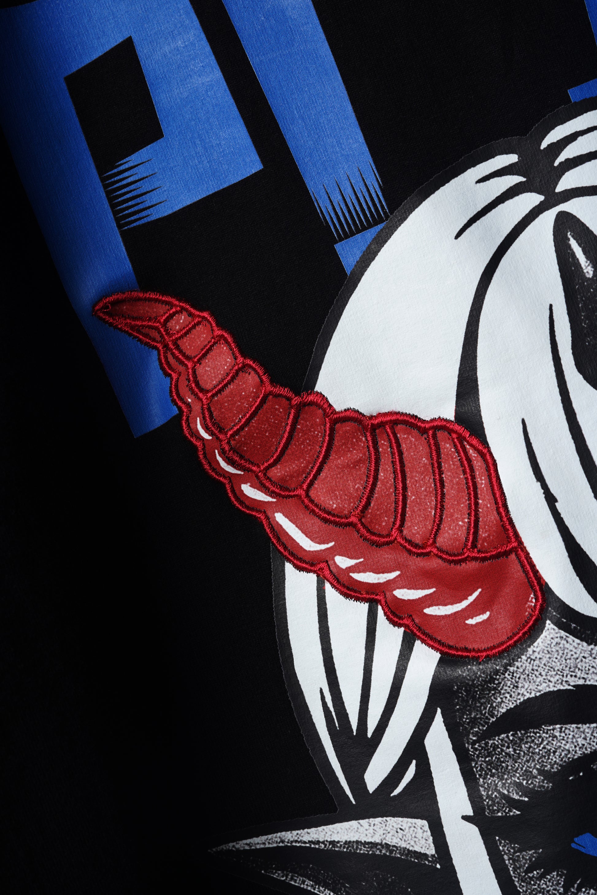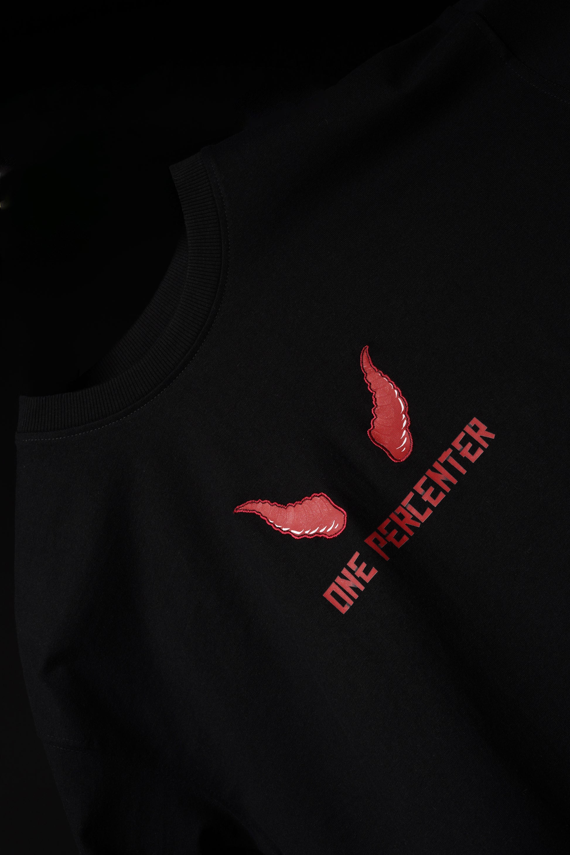 The 240 GSM T-shirt 'PLAY BOLD' comes in a sleek Jet Black color with print and embroidered horns both front and back. It offers a medium-heavyweight option for a defined and breathable structure. Featuring an oversized silhouette, the fit provides a clean and flowing drape.