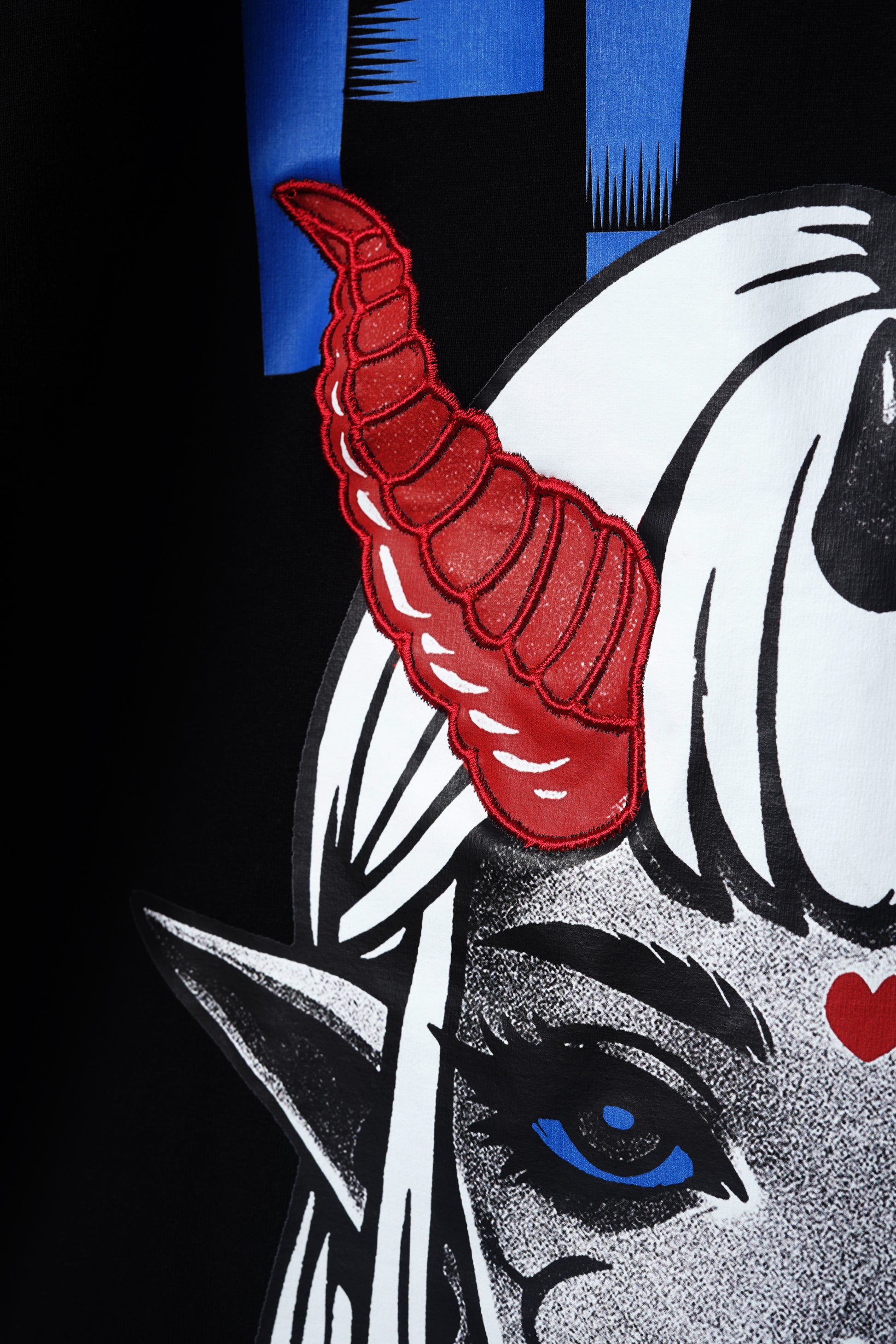 This tee is for the unapologetic. For the bold who don't follow the rules — they rewrite them. Featuring a fierce, otherworldly character with striking red horns and icy blue accents, this piece challenges the quiet and celebrates the daring and fearless.